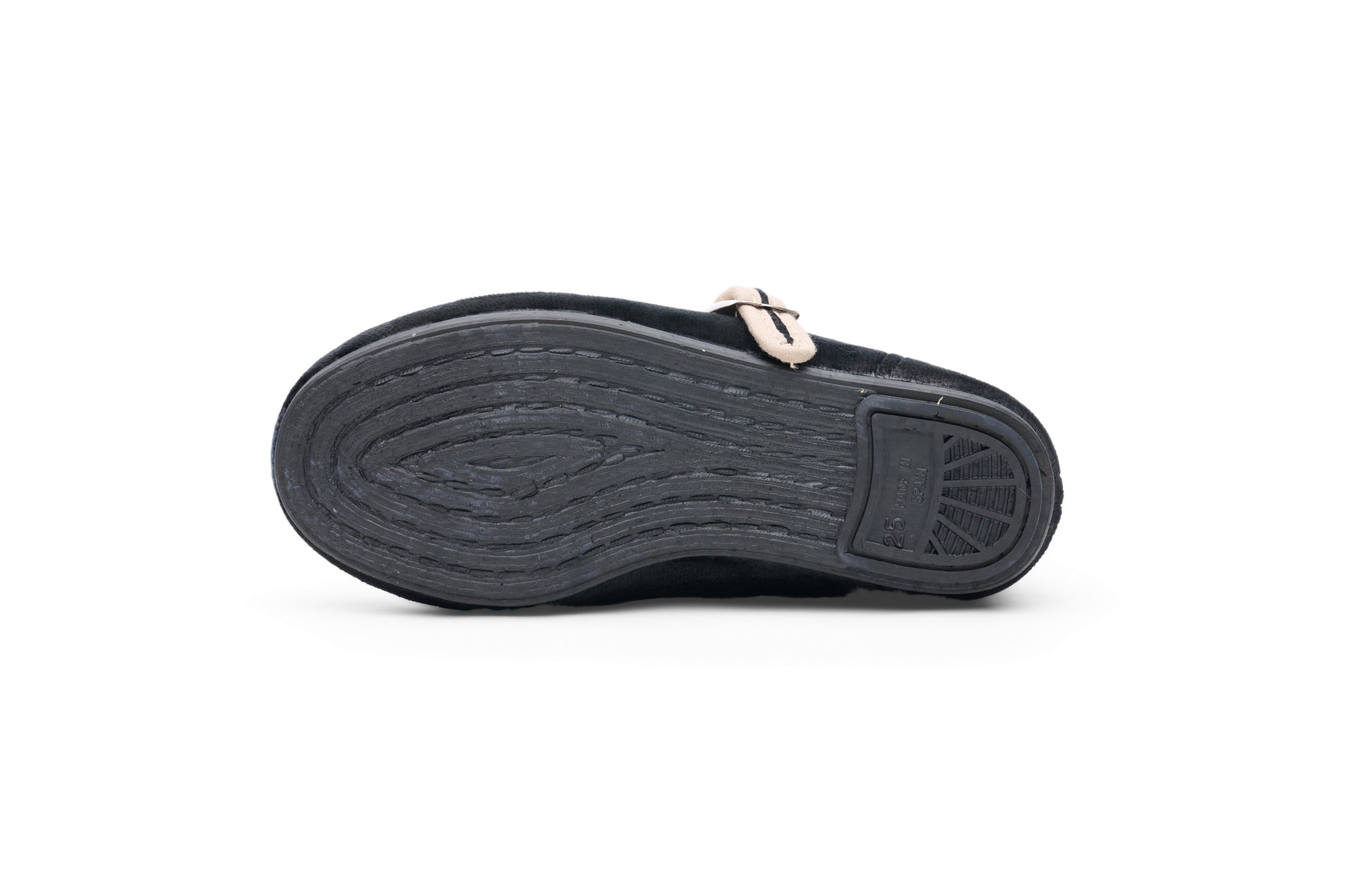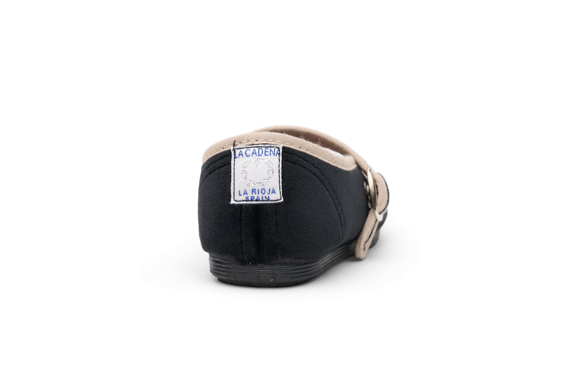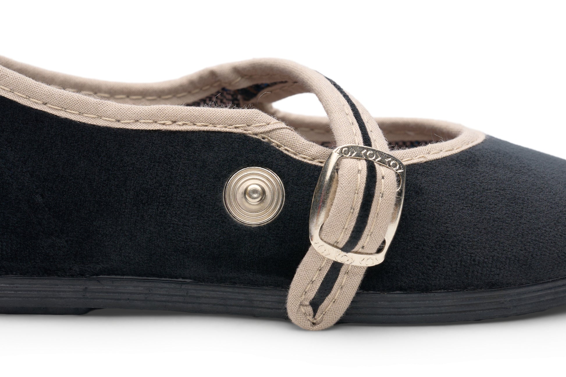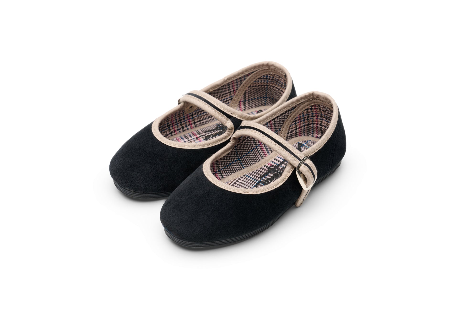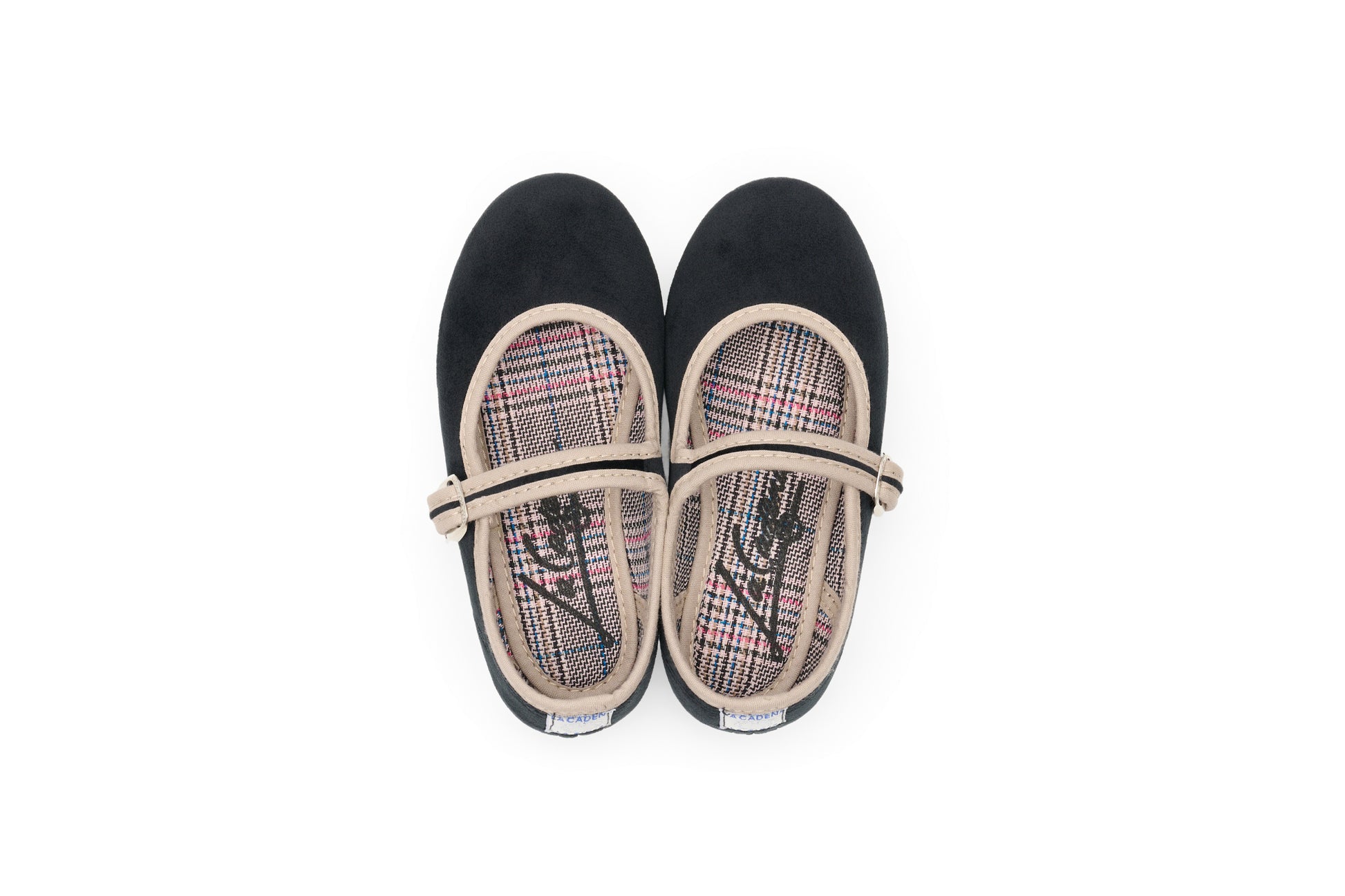 배색 장식과 체크 안감이 돋보이는 벨뱃 소재의 보헴 메리제인 슈즈