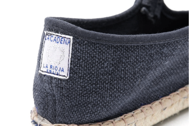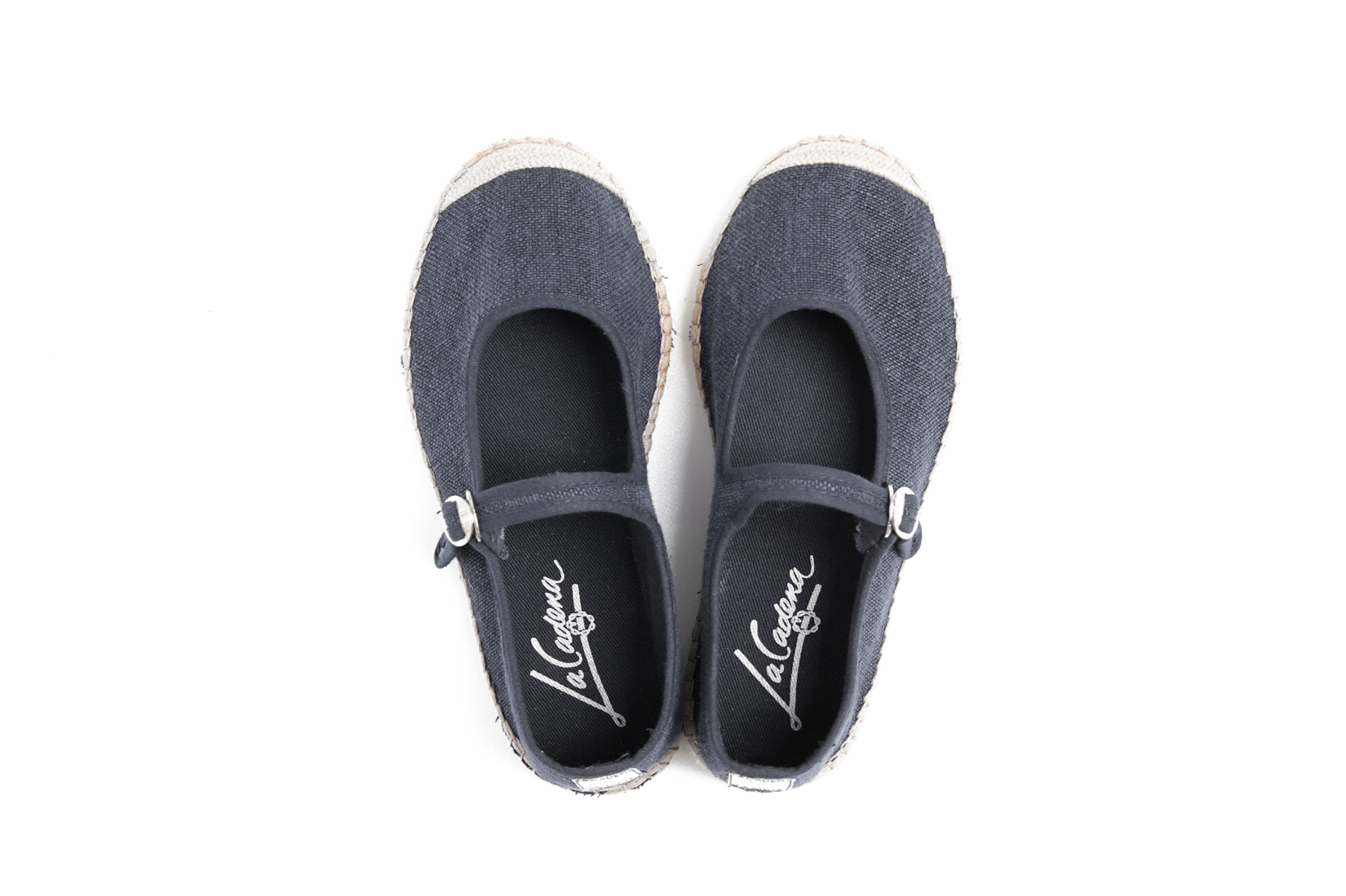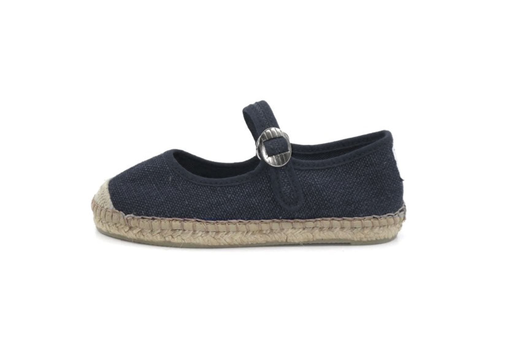 라카데나의 브랜드 라벨이 부착된 린넨 소재의 에스파드리유. 버클 뒤에 부착된 벨크로를 이용하여 아이 스스로 쉽게 여닫을 수 있습니다.