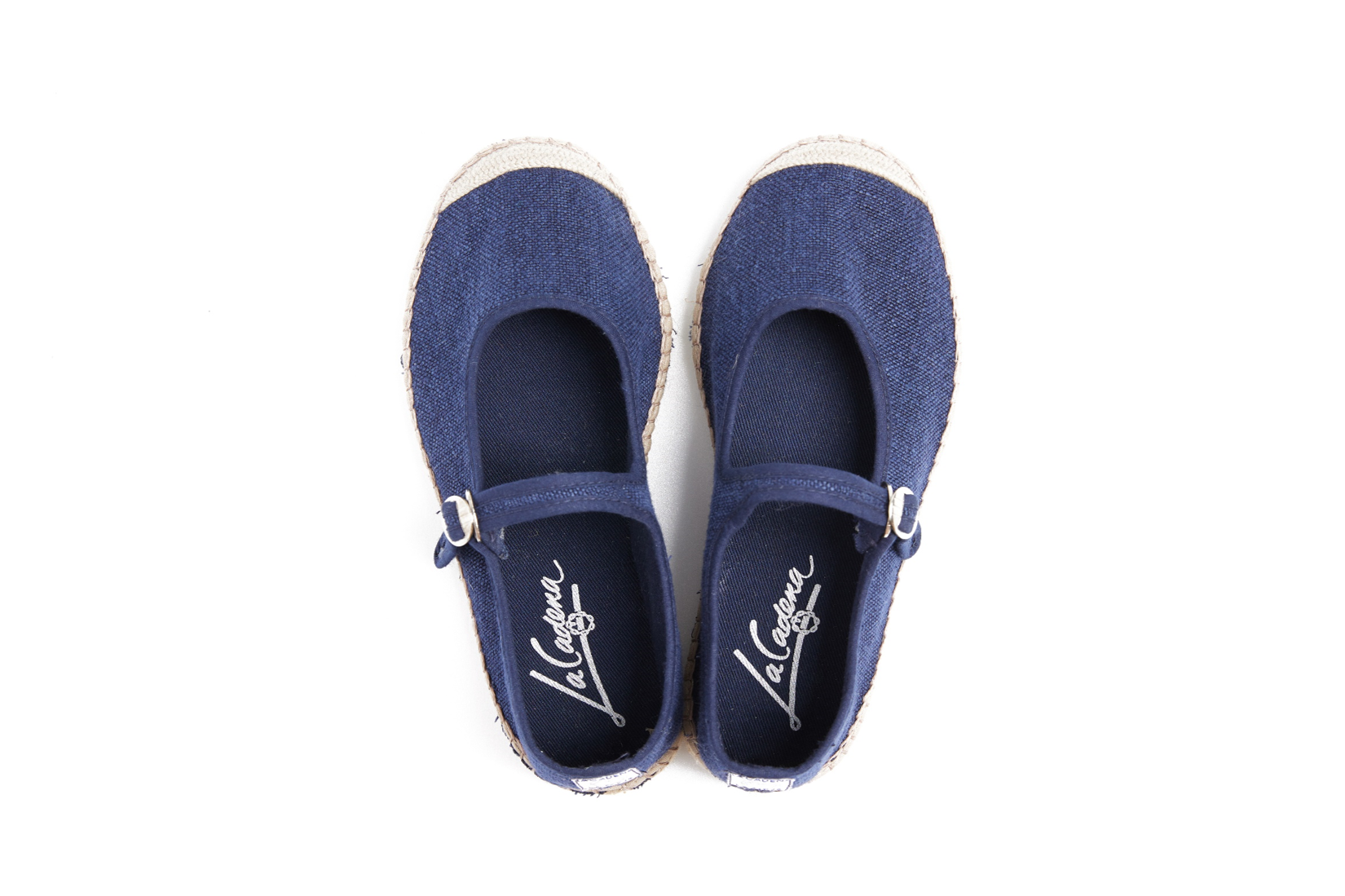 라카데나의 브랜드 라벨이 부착된 린넨 소재의 에스파드리유. 버클 뒤에 부착된 벨크로를 이용하여 아이 스스로 쉽게 여닫을 수 있습니다.