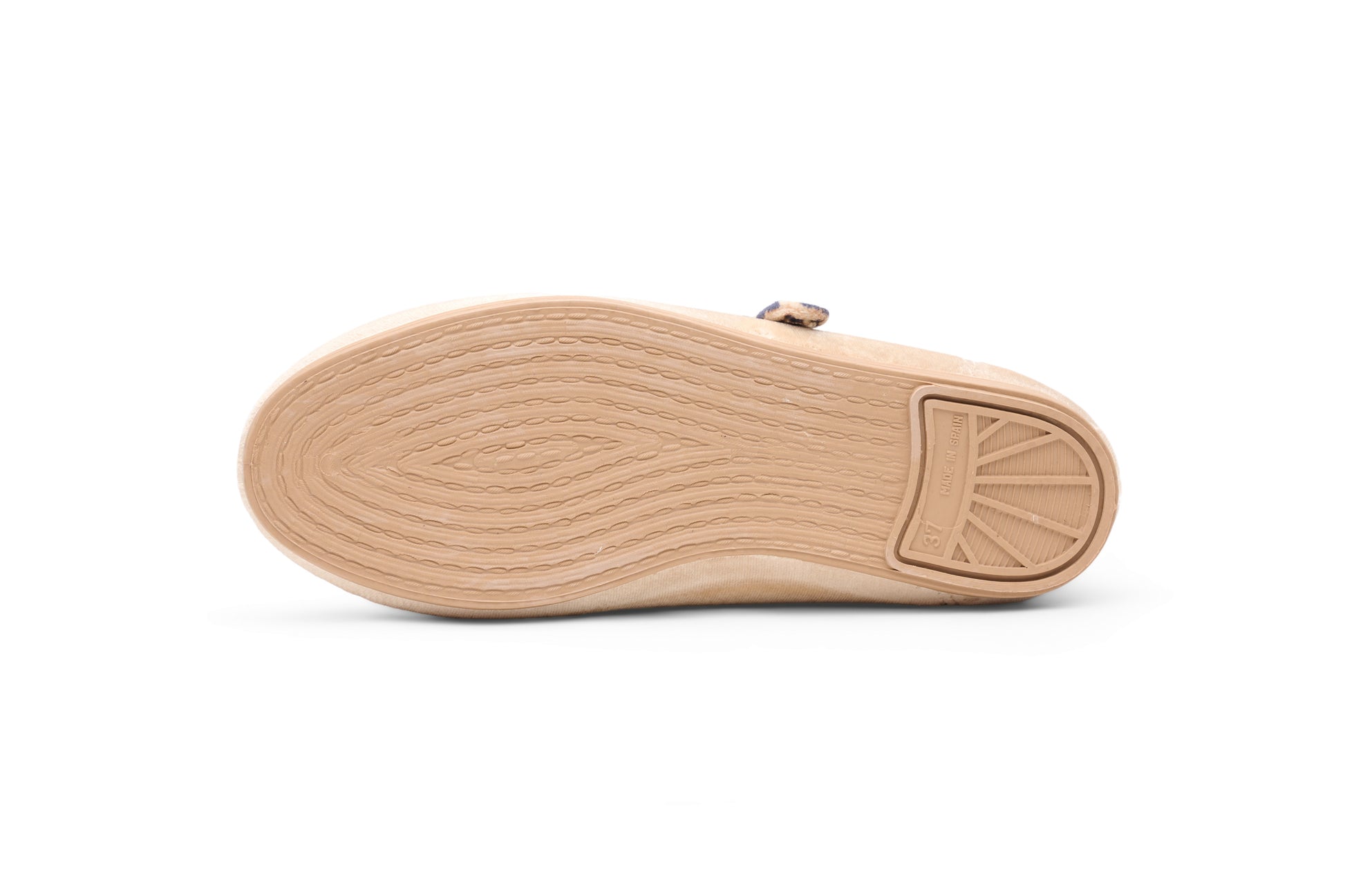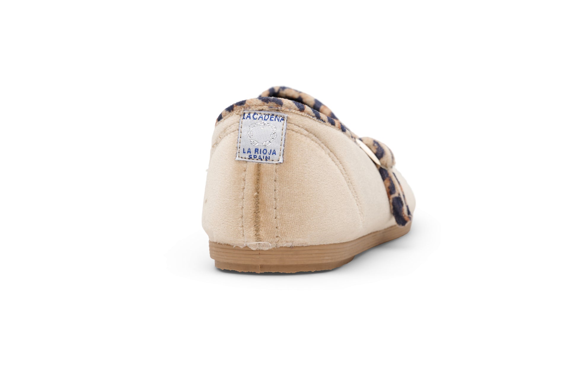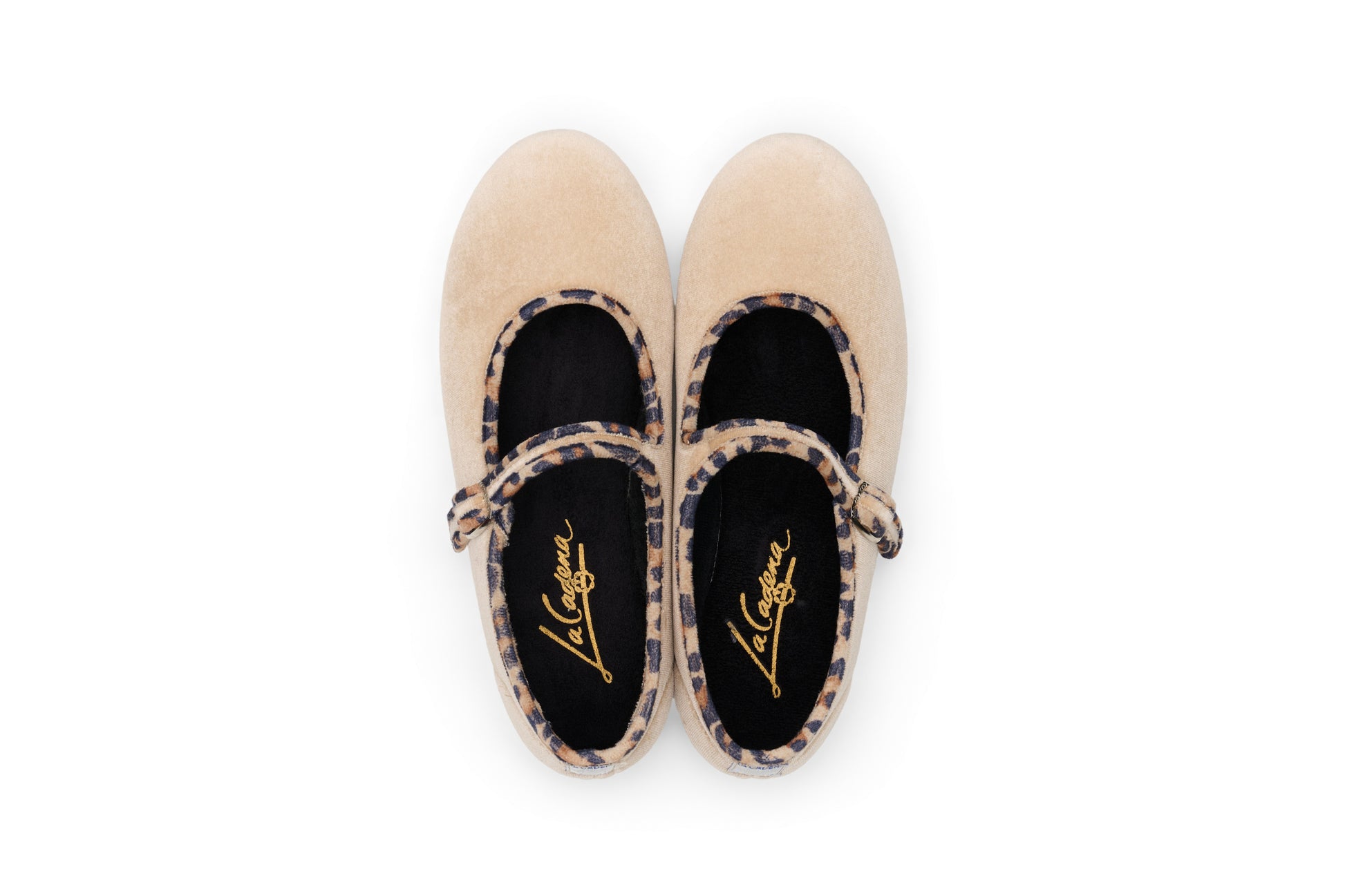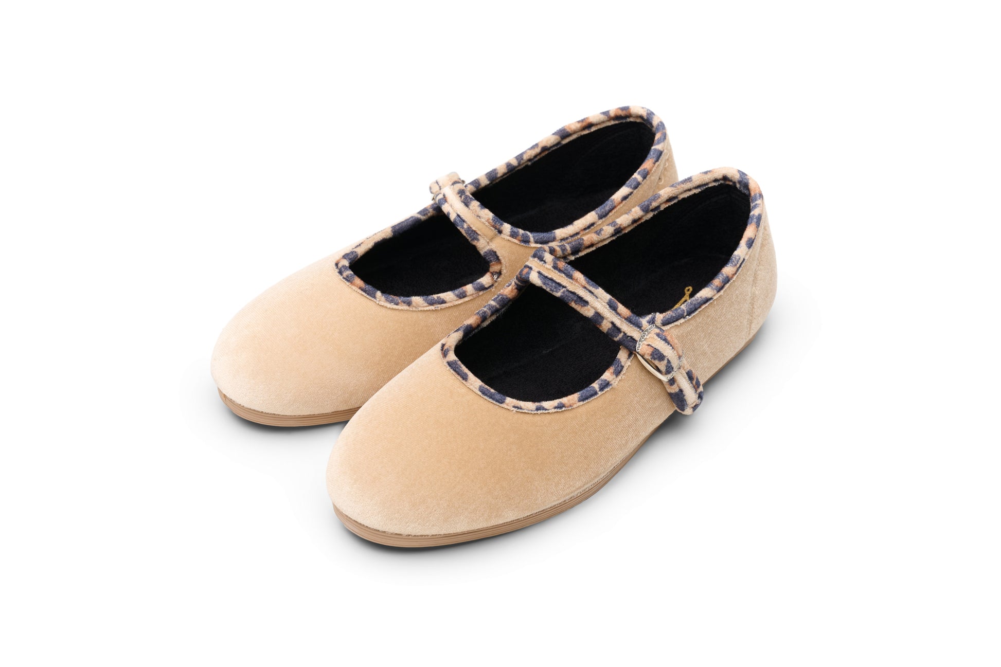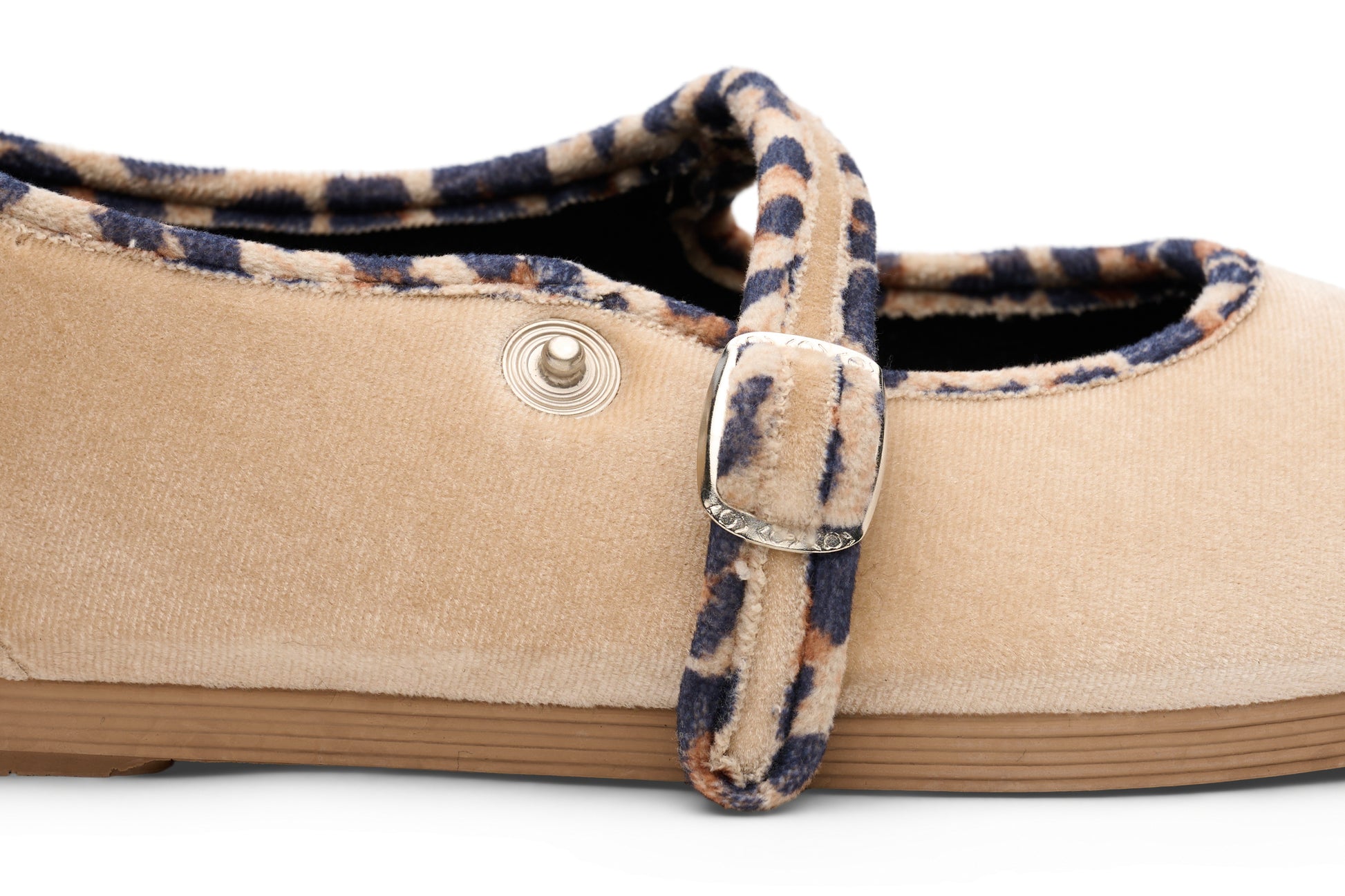 레오파드 트림으로 장식된 베이지 벨벳 소재의 메리제인. 똑딱이 버튼으로 쉽게 여닫을 수 있습니다.